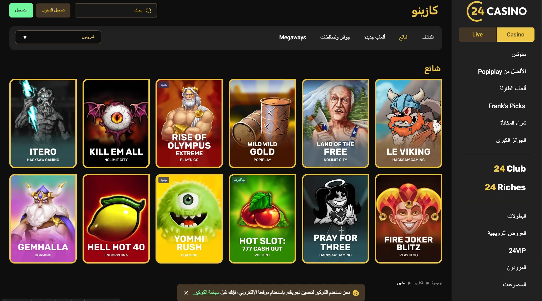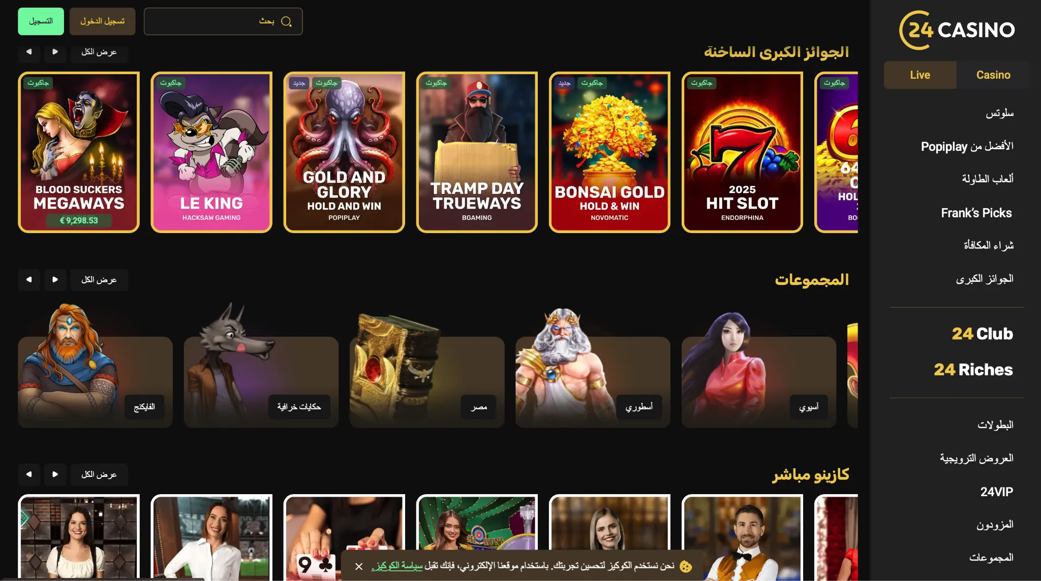 - تصميم مميز: تعطي واجهة موقع 24casino الرسمي في الدول العربية انطباعاً حديثاً مواكباً لأحدث الصيحات، وذلك بفضل ألوانها الجذابة وتنظيمها الواضح لأقسام الكازينو، الشيئ الذي يجعل التنقل داخل الكازينو سريعًا وبديهيًا.