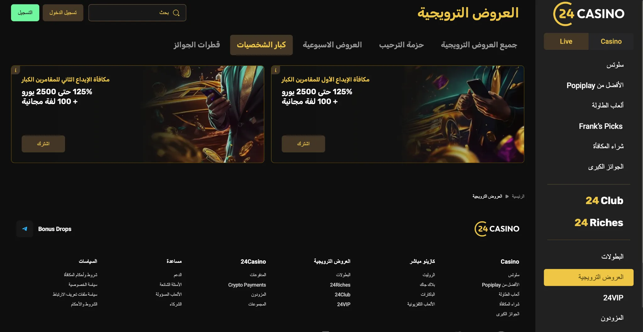 لا تقف عروض منصة 24casino عند الحزمة الترحيبية، بل يمكن للاعبين الاستفادة من عروض أسبوعية وشهرية مثيرة، من أبرزها: